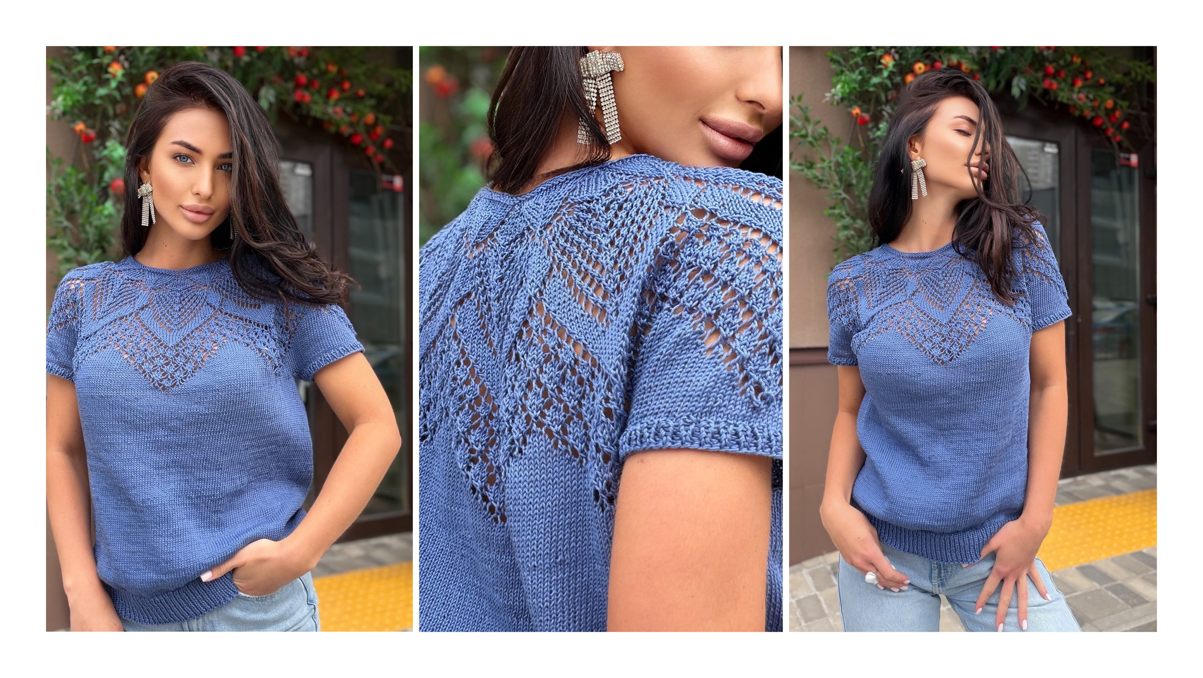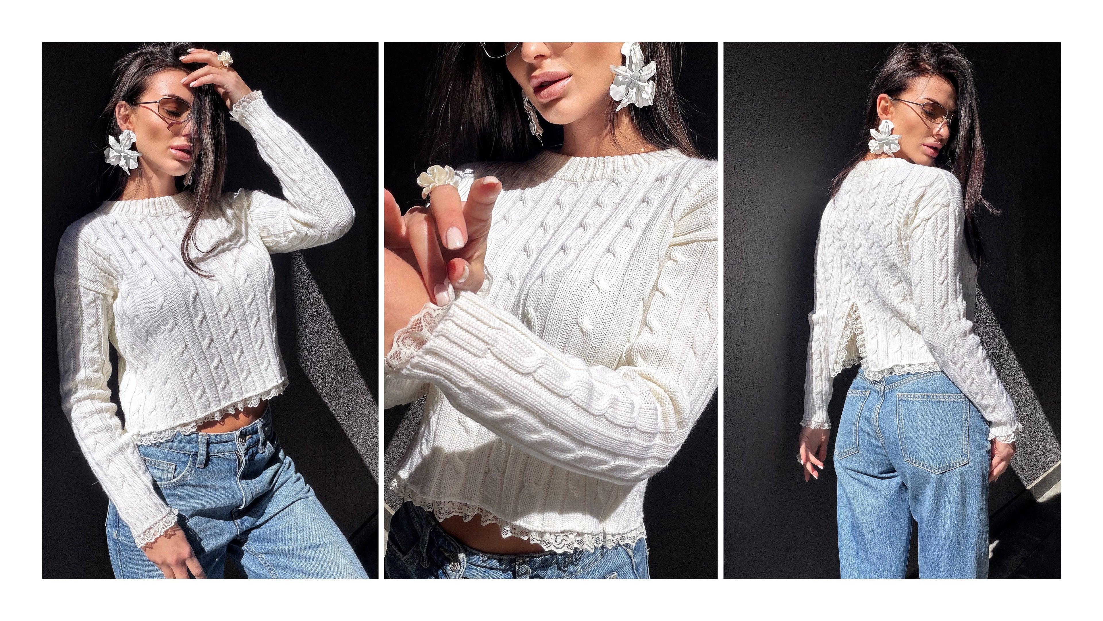 Knit cropped white milk sweater - top with slit on the back & delicate lace Cable knit wool spring pullover Oversize crop Cream Ivory