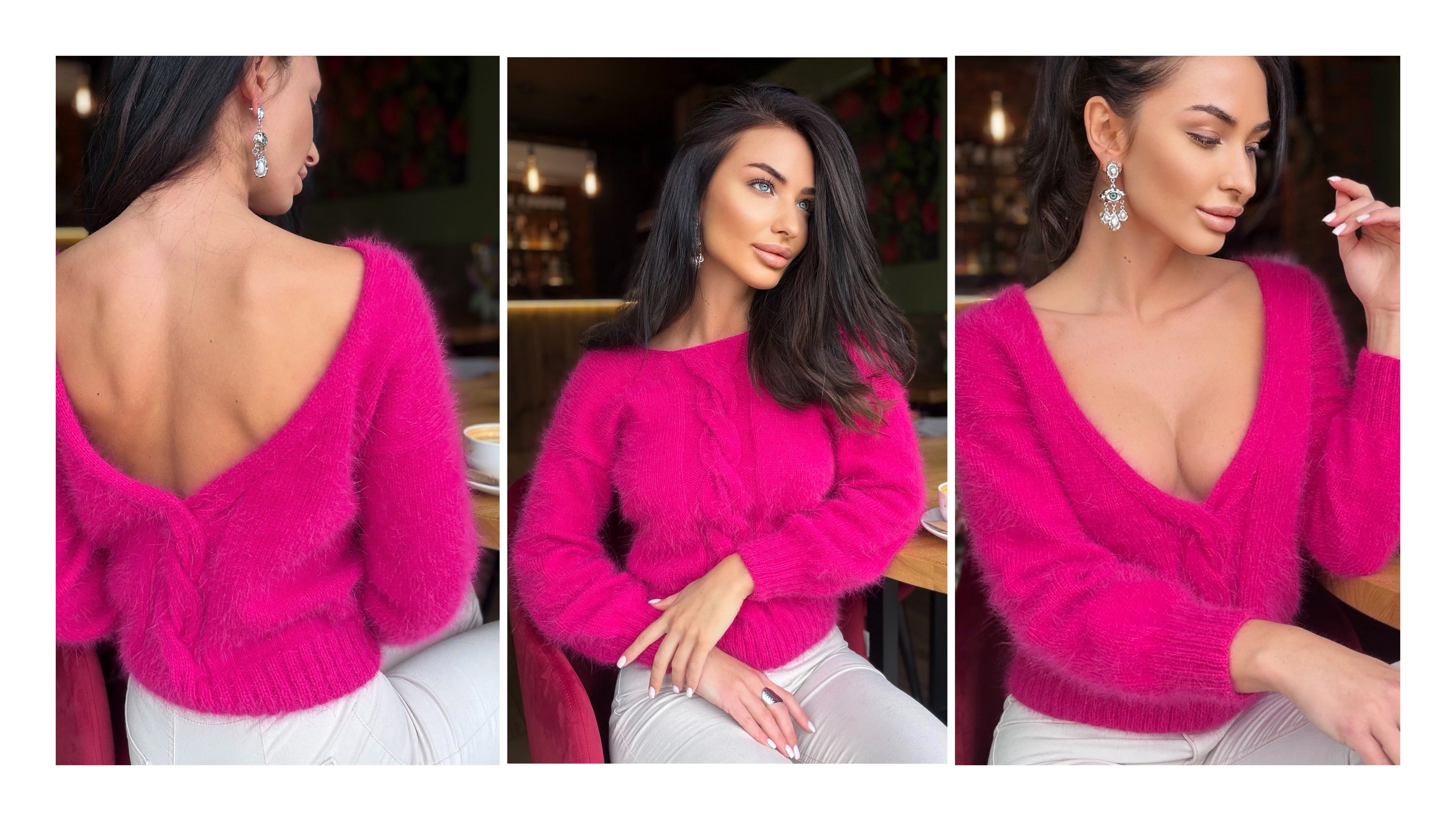 Angora light pink hand knit sweater Open back Deep neckline Pastel fluffy angora pullover Loose fit oversized V-neck long sleevs